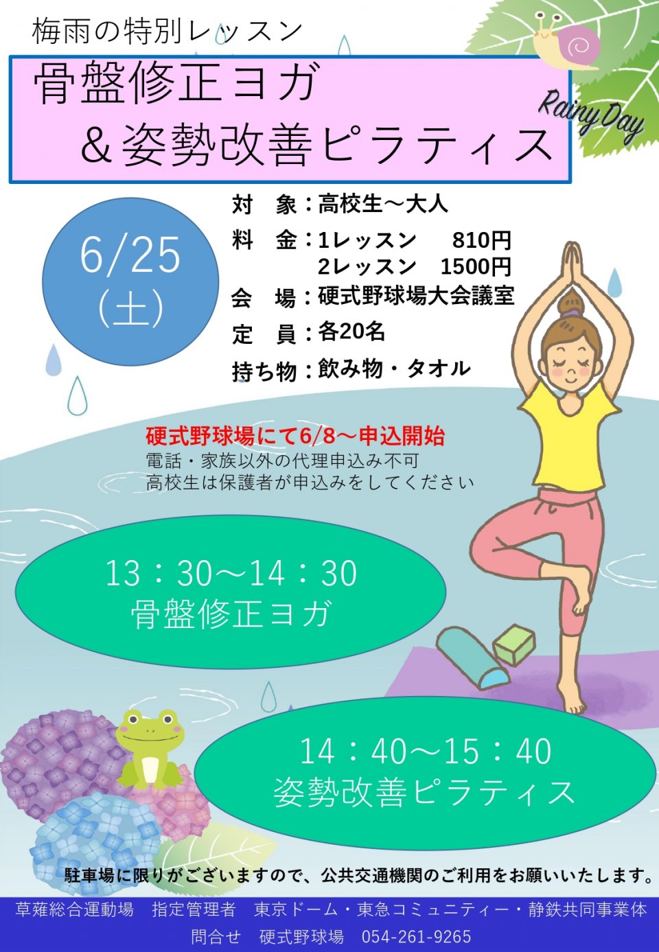 6/25(土)硬式野球場大会議室にて骨盤修正ヨガ&姿勢改善ピラティスの特別レッスンを開催します♪